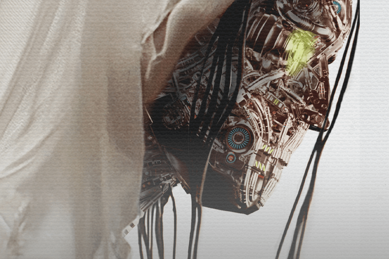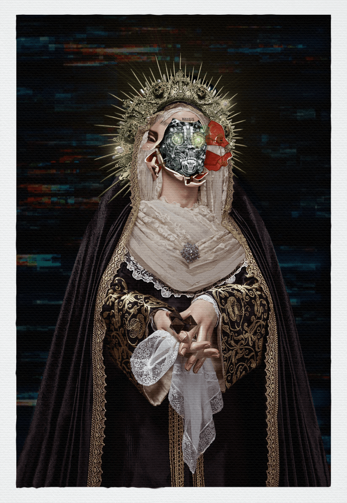 En este universo, lo sagrado no desaparece, sino que muta en protocolos visuales, máscaras y ensamblajes que cuestionan la autenticidad de la devoción en la era de la automatización. La imagen y semejanza con la que fue creado el humano se transforma con la intervención de la máquina, la figura divina ya no encarna un misterio insondable, sino un ser ensamblado.