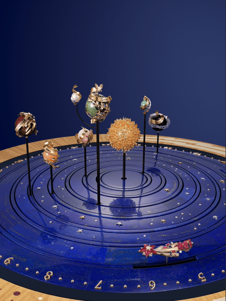Cada planeta, representado en forma tridimensional, orbita en torno al Sol y está envuelto por una cinta de oro con inscripciones inspiradas en cartas celestes del siglo XVIII. La simbología mitológica de cada astro se traduce en materiales preciosos: