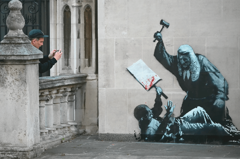 El 8 de septiembre en el exterior del Tribunal Superior de Justicia de Reino Unido, apareció un mural del artista mostrando a un personaje, que por sus características (peluca y toga), referenciaba a un juez, golpeando a un manifestante tirado en el suelo, que portaba una pancarta manchada de sangre, la obra no aludía a ninguna situación específica, pero se enmarcó en la polémica del grupo de Acción Palestina, en donde alrededor de 900 personas fueron detenidas.