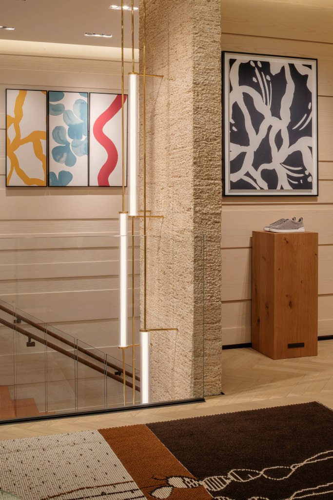 La escalera está enmarcada por dos grandes muros de travertino tallados con chorro de agua para recrear las formas que surgen tras siglos de erosión natural. Estos muros se elevan a lo largo de 8 metros en la escalera de doble altura, conectando los dos niveles de la tienda.