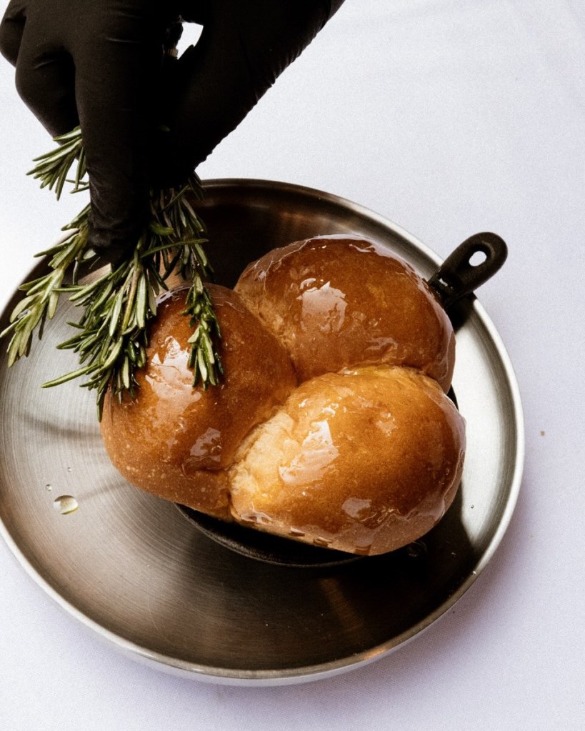 Llegó uno de los momentos más memorables de la tarde: el pan brioche recién horneado, embalsamado con aceite de oliva y espolvoreado con sal y ajo. Su textura era como tocar una nube, esponjosa y tibia, y el sabor… bueno, simplemente no hay palabras. Es de esos detalles que parecen simples pero que, cuando están perfectamente ejecutados, cambian por completo el ritmo de la mesa y confirman que aquí la experiencia se cuida desde el primer gesto. Además nos dejaron dos salsas de sus 100 opciones, ¡una locura! La salsa de zanahoría con habanero y una segunda salsa que era verde tatemada de chiles secos con kiwi por si queriamos darle un toque de picor a alguno de nuestros platillos. La de zanahoria nos encantó.