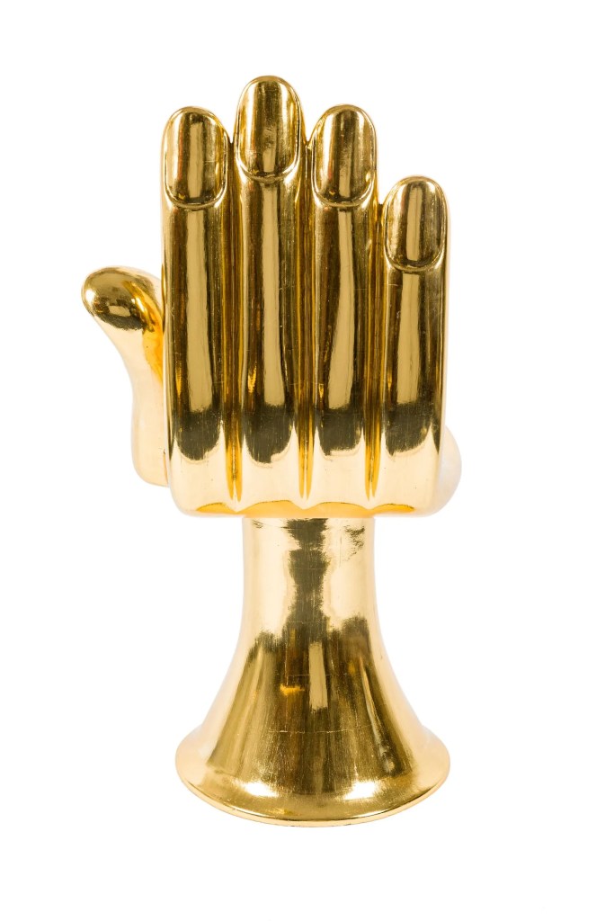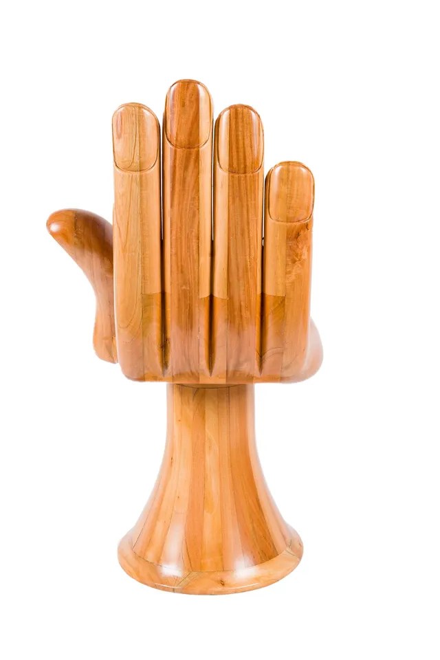 La silla tiene la forma de una mano abierta: La palma funciona como asiento, los dedos como respaldo y el pulgar como reposabrazos