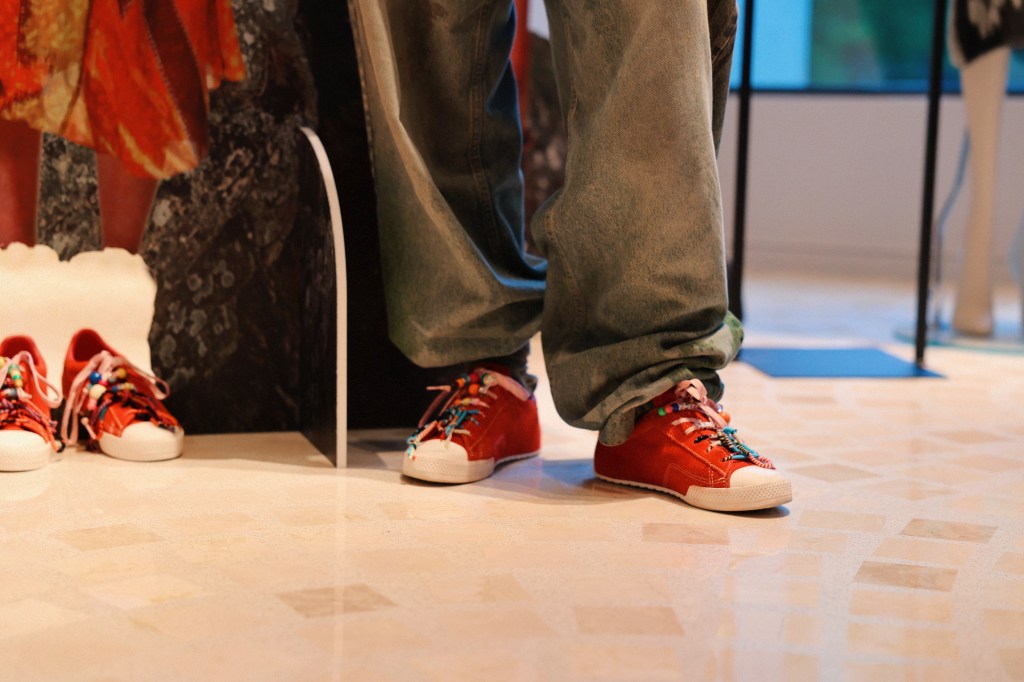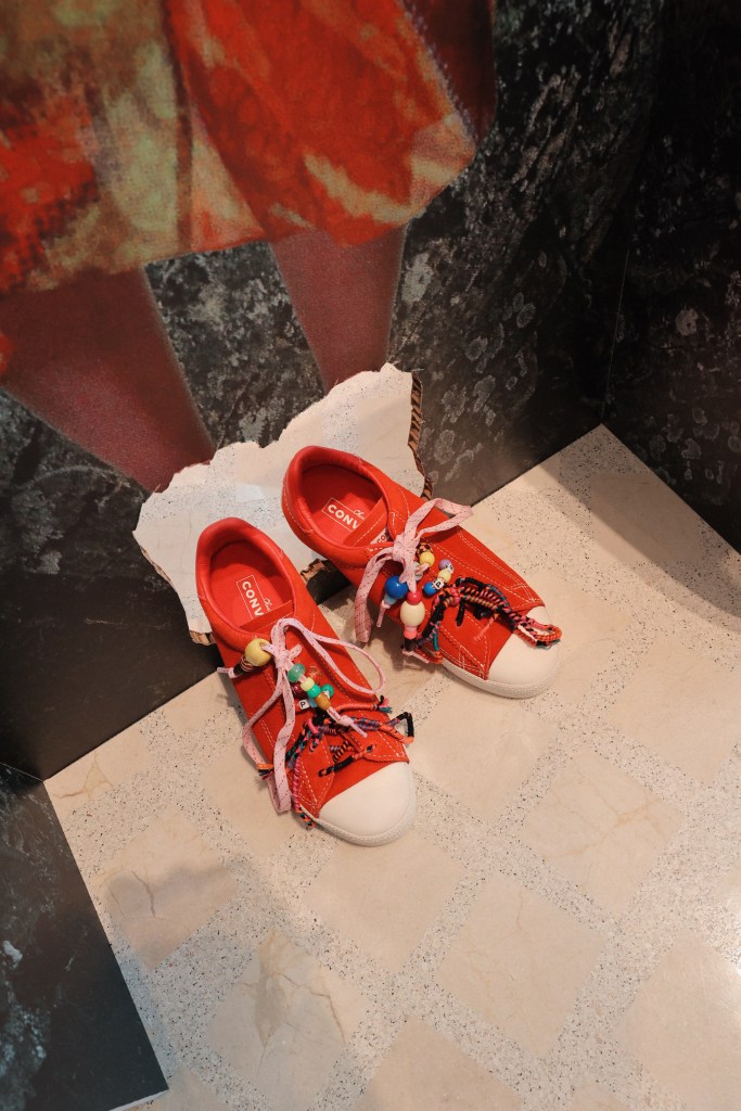 La colaboración con Converse no funciona como accesorio, sino como extensión natural del universo: las Chuck Taylor All Star intervenidas aparecen como piezas vivas dentro de la instalación. El taller paralelo, donde el público interviene su propio par, desplaza la autoría hacia lo colectivo: crear como acto compartido, no como gesto aislado.